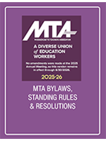 The Committee on Bylaws and Rules receives and processes proposed amendments to the MTA Bylaws and Standing Rules. The committee makes a report at the March meeting of the Board and subsequently presents proposed changes to the Annual Meeting of Delegates.